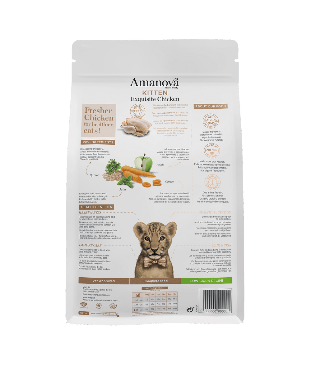 Ushqimi Kitten Exquisite Chicken është një ushqim hipoalergjen i formuluar posaçërisht për macet nga 2 muaj e lart. Përpiluar ekskluzivisht me pilesat e freskët si burimi i vetëm i proteinave shtazore, ai ofron nivele të larta proteine për zhvillimin dhe mirëmbajtjen e masës muskulare të macës. Formulimi special, i dizajnuar nga veterinerët, përfshin Taurinë për rritjen e shëndetshme të zemrës dhe ruajtjen e shikimit; Acidet yndyrore Omega-3, EPA dhe DHA për mirëmbajtjen e lëkurës së shëndetshme, një manteli të fortë dhe shkëlqyes, si dhe forcimin e aftësive njohëse; dhe kalcium për zhvillimin optimal të kockave. Me përmbajtje të ulët të drithërave dhe formulim hipoalergjen, ky ushqim është zgjedhja ideale për macet e ndjeshme.