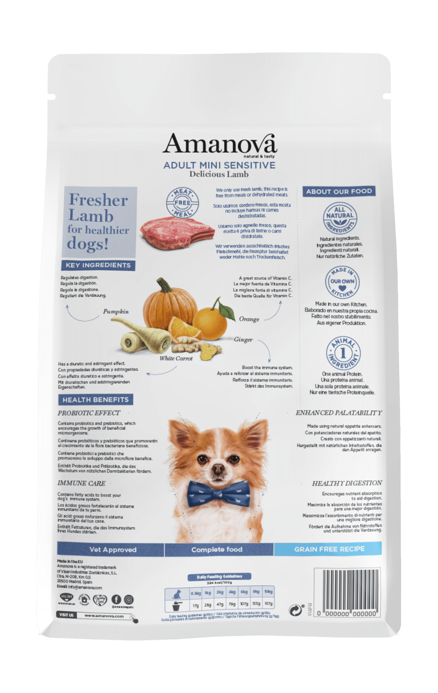 Amanova Adult Mini Sensitive është një recetë pa drithëra për qen të vegjël të rritur, e projektuar posaçërisht për ata me lëkurë dhe qime të ndjeshme ose me tretje të ndjeshme. E përgatitur nga qengji i freskët, si një burim unik i proteinave shtazore, është ideale për të shmangur alergjitë dhe intolerancat e mundshme ushqimore. E zhvilluar nga veterinerët, kjo formulë e veçantë përmban lëndë ushqyese dhe superushqime të rëndësishme si kungulli, portokalli dhe xhenxhefili që do të forcojnë sistemin imunitar të qenit tuaj. Përveç kësaj, kombinimi i zinkut dhe acideve yndyrore që përmban kontribuon në bukurinë dhe shëndetin e mirë të lëkurës dhe qimeve.